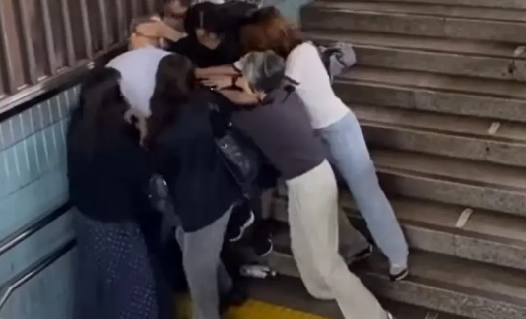 Οι γυναίκες έσπρωξαν όλες μαζί τον άνδρα, καταφέρνοντας να τον ακινητοποιήσουν στις σκάλες του σταθμού. Όχι μόνο τον ακινιτοποίησαν, αλλά τον κρατούσαν όπως μπορούσαν μέχρι να έρθουν στο σημείο δυνάμεις της αστυνομίας, για να συλλάβουν τον δράστη.
