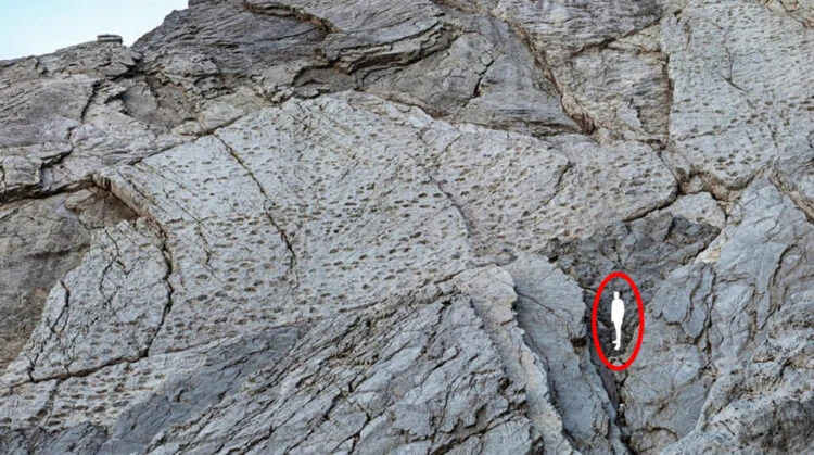 Τα αποτυπώματα — ορισμένα από τα οποία φτάνουν τα 40 εκατοστά σε διάμετρο — είναι ευθυγραμμισμένα σε παράλληλες σειρές, ενώ σε πολλά διακρίνονται καθαρά ίχνη από δάχτυλα και νύχια.