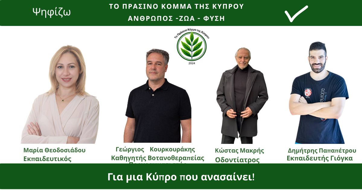 Το Πράσινο Κόμμα της Κύπρου-Green Party Cyprus μπαίνει δυναμικά στην κούρσα των εκλογών,ανακοινώνοντας τους 4 πρώτους υποψήφιους βουλευτές.